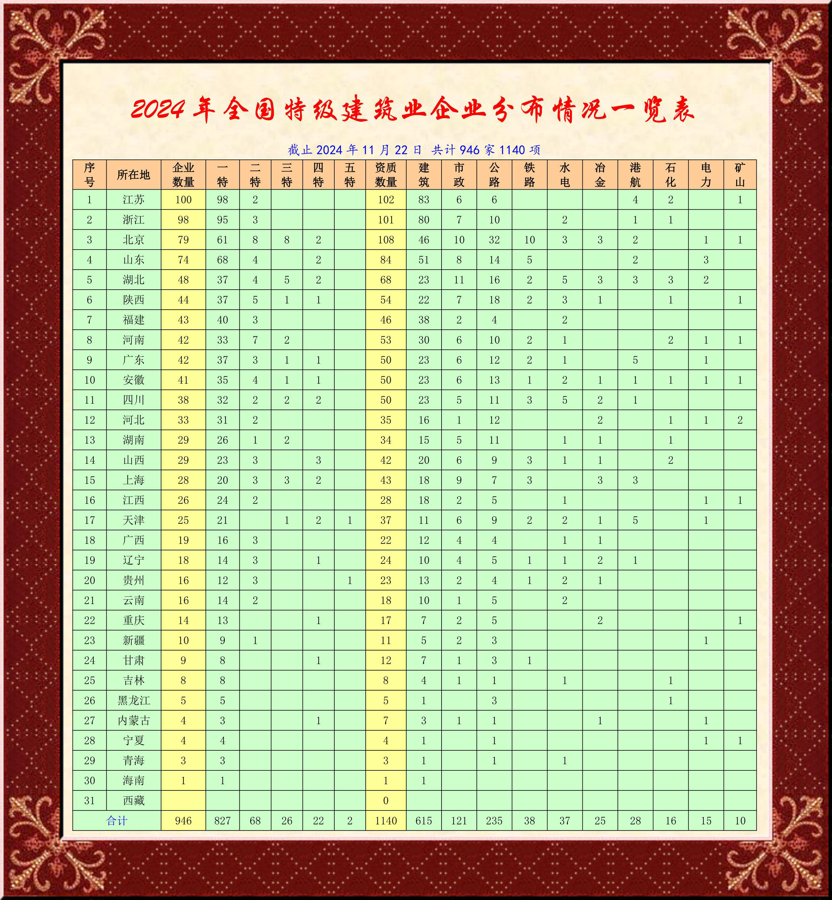 根據(jù)《中華人民共和國(guó)建筑法》及有關(guān)建設(shè)工程企業(yè)資質(zhì)管理規(guī)定,現(xiàn)將我部核準(zhǔn)的工程勘察資質(zhì)、工程設(shè)計(jì)資質(zhì)、建筑業(yè)企業(yè)資質(zhì)、工程監(jiān)理企業(yè)資質(zhì)的單位名單(2024年度第十一批)予以公布。未予核準(zhǔn)的單位可登錄住房城鄉(xiāng)建設(shè)部政務(wù)服務(wù)門(mén)戶(hù),點(diǎn)擊“申請(qǐng)事項(xiàng)辦理進(jìn)度查詢(xún)(受理發(fā)證信息查詢(xún))”欄目查詢(xún)?cè)颉?