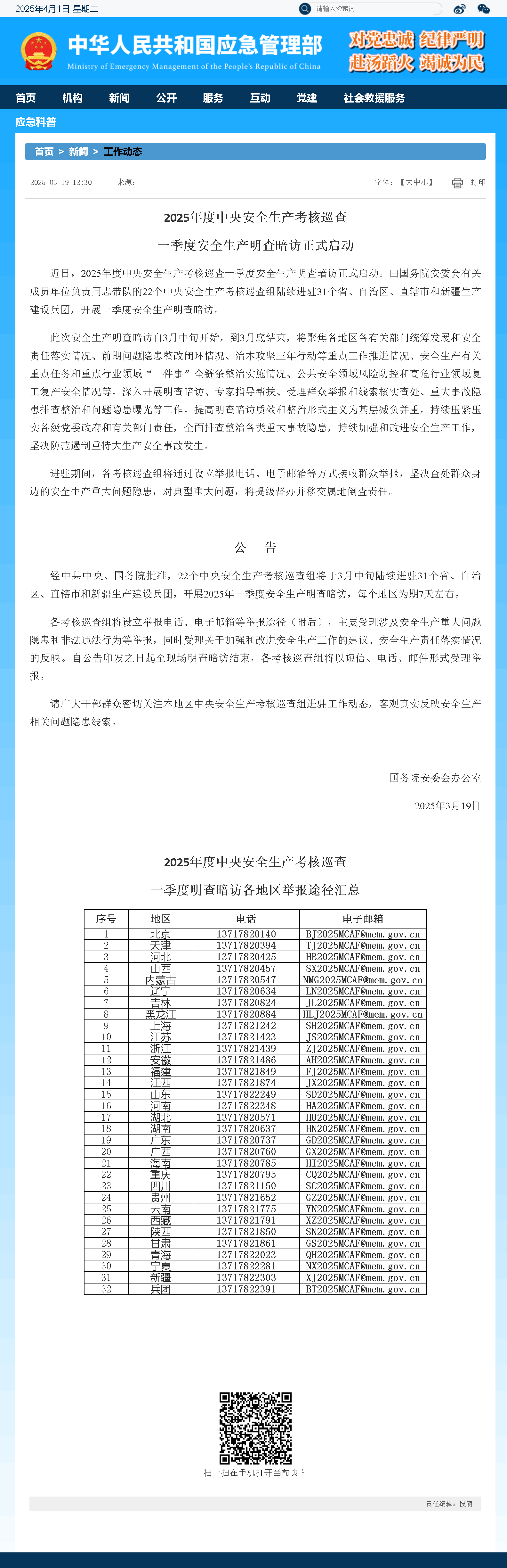 近日,2025年度中央安全生產(chǎn)考核巡查一季度安全生產(chǎn)明查暗訪正式啟動(dòng)。由國(guó)務(wù)院安委會(huì)有關(guān)成員單位負(fù)責(zé)同志帶隊(duì)的22個(gè)中央安全生產(chǎn)考核巡查組陸續(xù)進(jìn)駐31個(gè)省、自治區(qū)、直轄市和新疆生產(chǎn)建設(shè)兵團(tuán),開(kāi)展一季度安全生產(chǎn)明查暗訪。