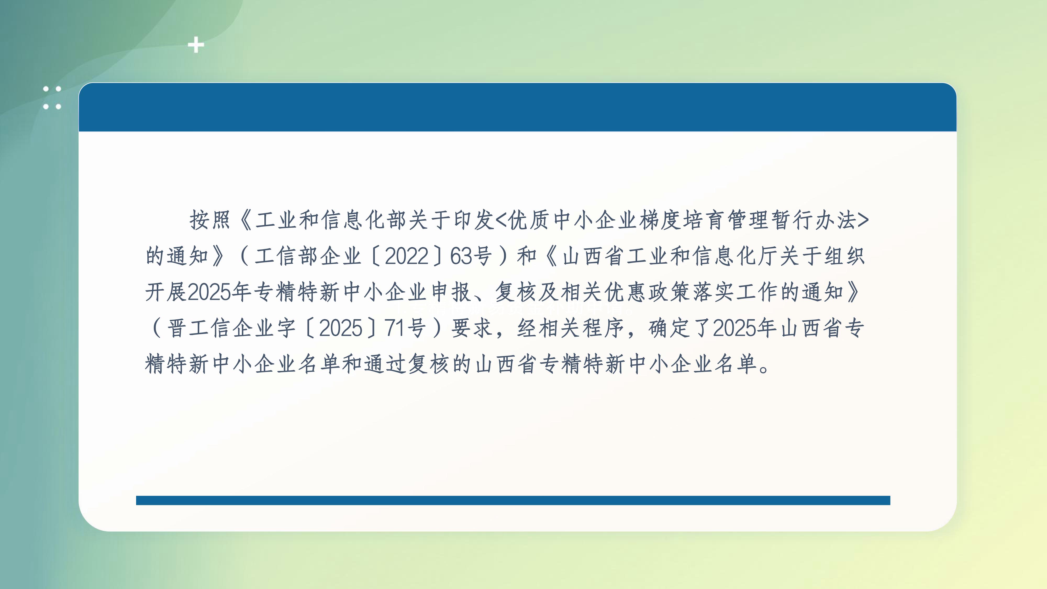 按照《工業(yè)和信息化部關(guān)于印發(fā)<優(yōu)質(zhì)中小企業(yè)梯度培育管理暫行辦法>的通知》和《山西省工業(yè)和信息化廳關(guān)于組織開展2025年專精特新中小企業(yè)申報、復(fù)核及相關(guān)優(yōu)惠政策落實工作的通知》要求,經(jīng)相關(guān)程序,確定了2025年山西省專精特新中小企業(yè)名單和通過復(fù)核的山西省專精特新中小企業(yè)名單。