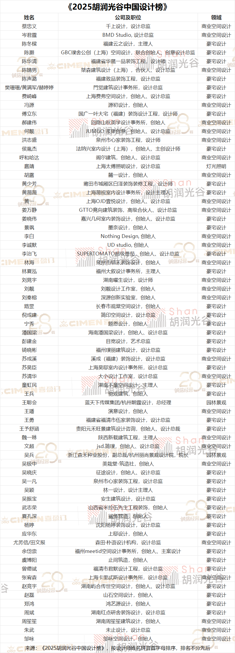 中新網(wǎng)上海新聞9月26日電(記者 繆璐)胡潤(rùn)光谷攜手戰(zhàn)略合作伙伴喜盈門(mén)集團(tuán),以及協(xié)辦單位ARENA場(chǎng)所26日聯(lián)合發(fā)布《2025胡潤(rùn)光谷中國(guó)設(shè)計(jì)榜》。榜單分為兩個(gè)部分:主榜單《2025胡潤(rùn)光谷中國(guó)設(shè)計(jì)榜》及子榜單《2025胡潤(rùn)光谷設(shè)計(jì)師推薦品牌》。