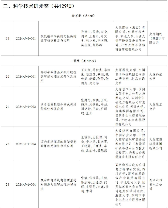 根據(jù)《山西省科學(xué)技術(shù)獎(jiǎng)勵(lì)辦法》等有關(guān)規(guī)定,經(jīng)省科學(xué)技術(shù)獎(jiǎng)勵(lì)評(píng)審委員會(huì)評(píng)審、省委科技委員會(huì)審定,授予“遺煤開采承載結(jié)構(gòu)失穩(wěn)致災(zāi)機(jī)理及關(guān)鍵域充填儲(chǔ)碳空間重構(gòu)方法”和“極低磁導(dǎo)率高拋光性高耐蝕不銹鋼開發(fā)與應(yīng)用”2個(gè)項(xiàng)目特等獎(jiǎng),授予“異形半導(dǎo)體晶片微米級(jí)視覺智能檢測(cè)技術(shù)開發(fā)及應(yīng)用”等36個(gè)項(xiàng)目一等獎(jiǎng),授予“高密度高精度微電子組裝智能裝備關(guān)鍵技術(shù)及應(yīng)用”等161個(gè)項(xiàng)目二等獎(jiǎng),授予“晉能控股裝備制造集團(tuán)有限公司”等6個(gè)企業(yè)技術(shù)創(chuàng)新獎(jiǎng)。