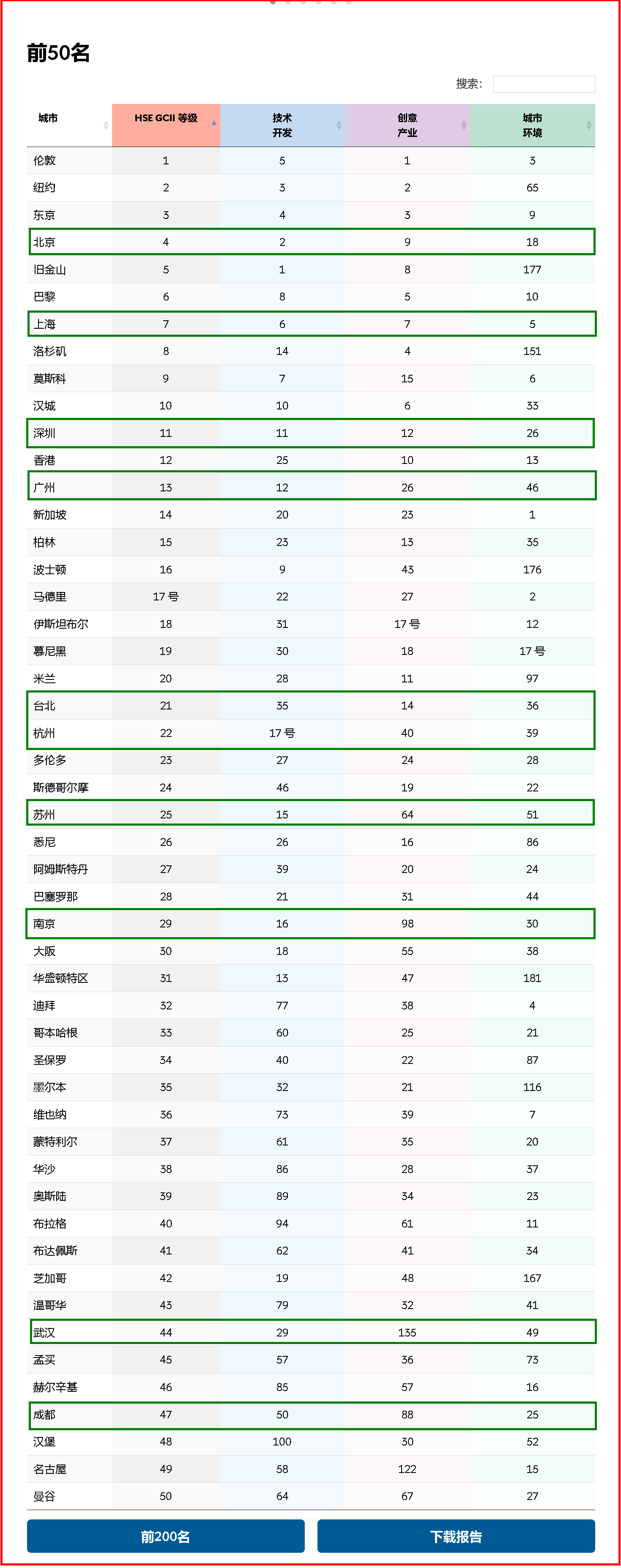 該分析報(bào)告包括一份包含1,127 個(gè)城市的擴(kuò)展名單 (其中已確定了兩個(gè)或以上技術(shù)和創(chuàng)意領(lǐng)導(dǎo)者),以及根據(jù) 90 項(xiàng)指標(biāo)(分為 21 個(gè)部分)的 2024 年200 個(gè)最具吸引力創(chuàng)新中心的短名單。三個(gè)板塊——技術(shù)發(fā)展、創(chuàng)意產(chǎn)業(yè)和城市環(huán)境)。
