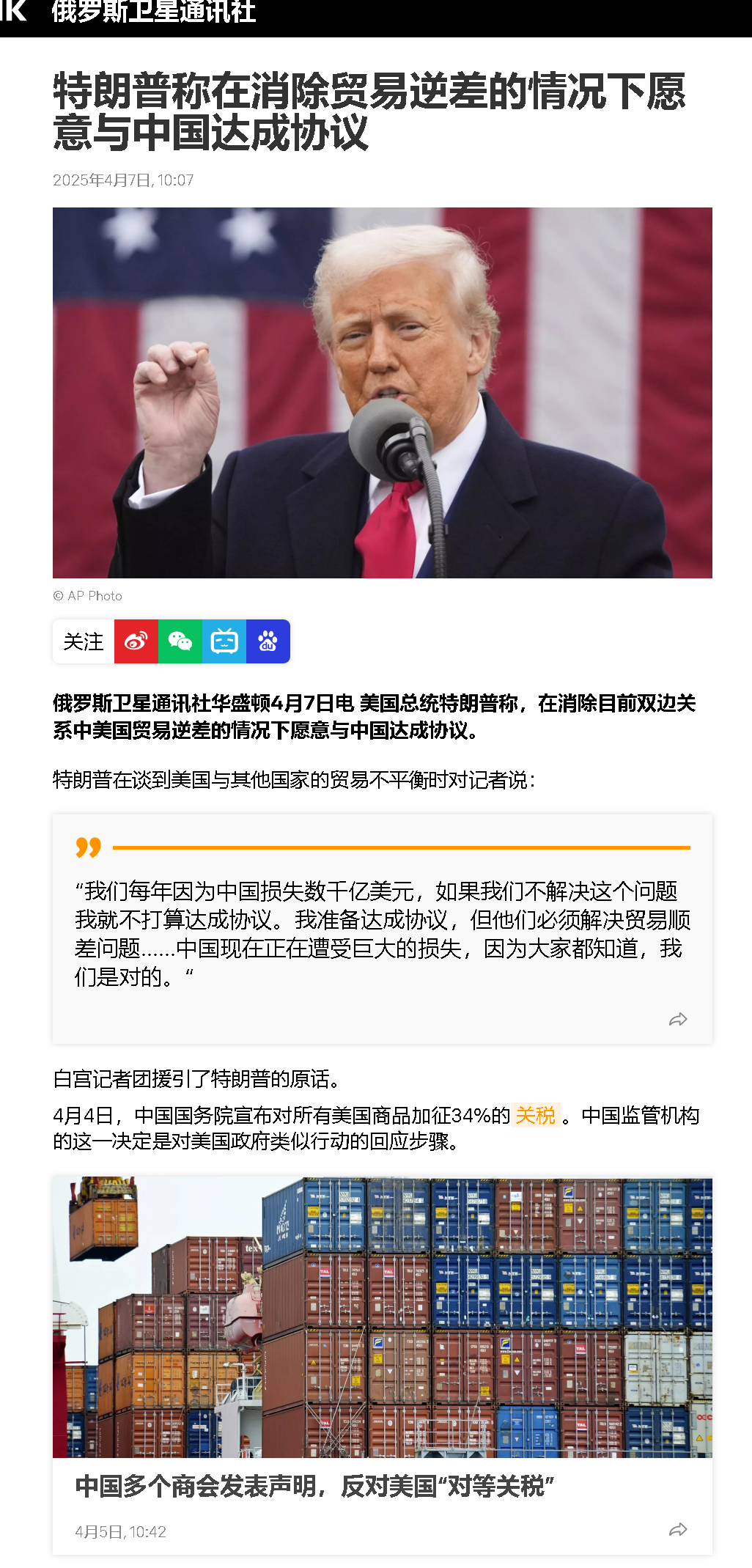當(dāng)特朗普政府揮舞"對(duì)等關(guān)稅"大棒時(shí),其本質(zhì)是企圖用19世紀(jì)的殖民邏輯重構(gòu)21世紀(jì)的全球經(jīng)貿(mào)秩序。中國以精準(zhǔn)反制破局,不僅捍衛(wèi)了國家利益,更掀起了全球治理體系變革的浪潮。在這場重塑世界經(jīng)濟(jì)秩序的博弈中,中國以"開放型反制"戰(zhàn)略,構(gòu)建起多邊主義新范式??梢哉f,可能連特朗普都萬萬沒有想到,我國的反制這么的“快很準(zhǔn)”?;蛟S是迫于國內(nèi)民眾的壓力,特朗普的關(guān)稅態(tài)度出現(xiàn)轉(zhuǎn)變,提出減稅條件:只要美國和中國的貿(mào)易逆差問題能夠得到解決,就可以達(dá)到關(guān)稅和解協(xié)議。