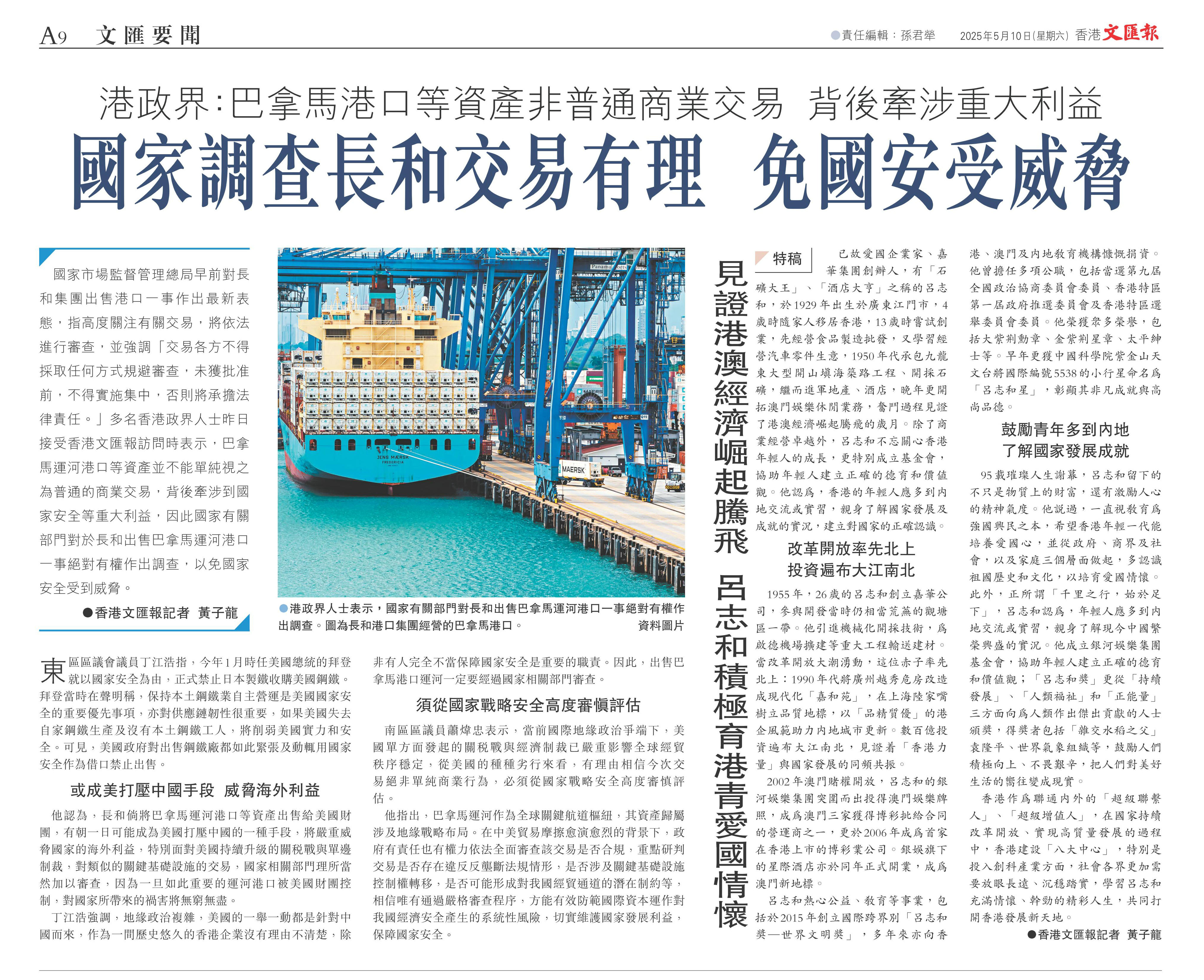 他認(rèn)為,長和倘將巴拿馬運河港口等資產(chǎn)出售給美國財團,有朝一日可能成為美國打壓中國的一種手段,將嚴(yán)重威脅國家的海外利益,特別面對美國持續(xù)升級的關(guān)稅戰(zhàn)與單邊制裁,對類似的關(guān)鍵基礎(chǔ)設(shè)施的交易,國家相關(guān)部門理所當(dāng)然加以審查,因為一旦如此重要的運河港口被美國財團控制,對國家所帶來的禍害將無窮無盡。