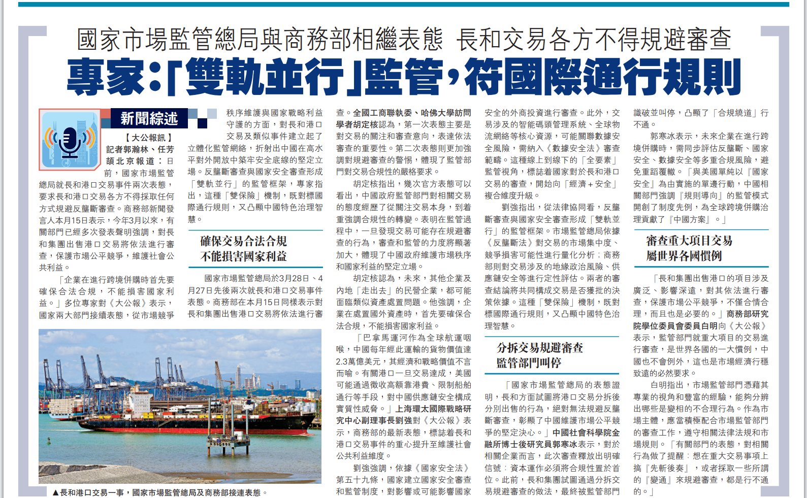 「企業(yè)在進(jìn)行跨境并購時(shí)首先要確保合法合規(guī),不能損害國家利益?!苟辔粚<覍?duì)《大公報(bào)》表示,國家兩大部門接續(xù)表態(tài),從市場競爭秩序維護(hù)與國家戰(zhàn)略利益守護(hù)的方面,對(duì)長和港口交易及類似事件建立起了立體化監(jiān)管網(wǎng)絡(luò),折射出中國在高水平對(duì)外開放中筑牢安全底線的堅(jiān)定立場。反壟斷審查與國家安全審查形成「雙軌并行」的監(jiān)管框架,專家指出,這種「雙保險(xiǎn)」機(jī)制,既對(duì)標(biāo)國際通行規(guī)則,又凸顯中國特色治理智慧。