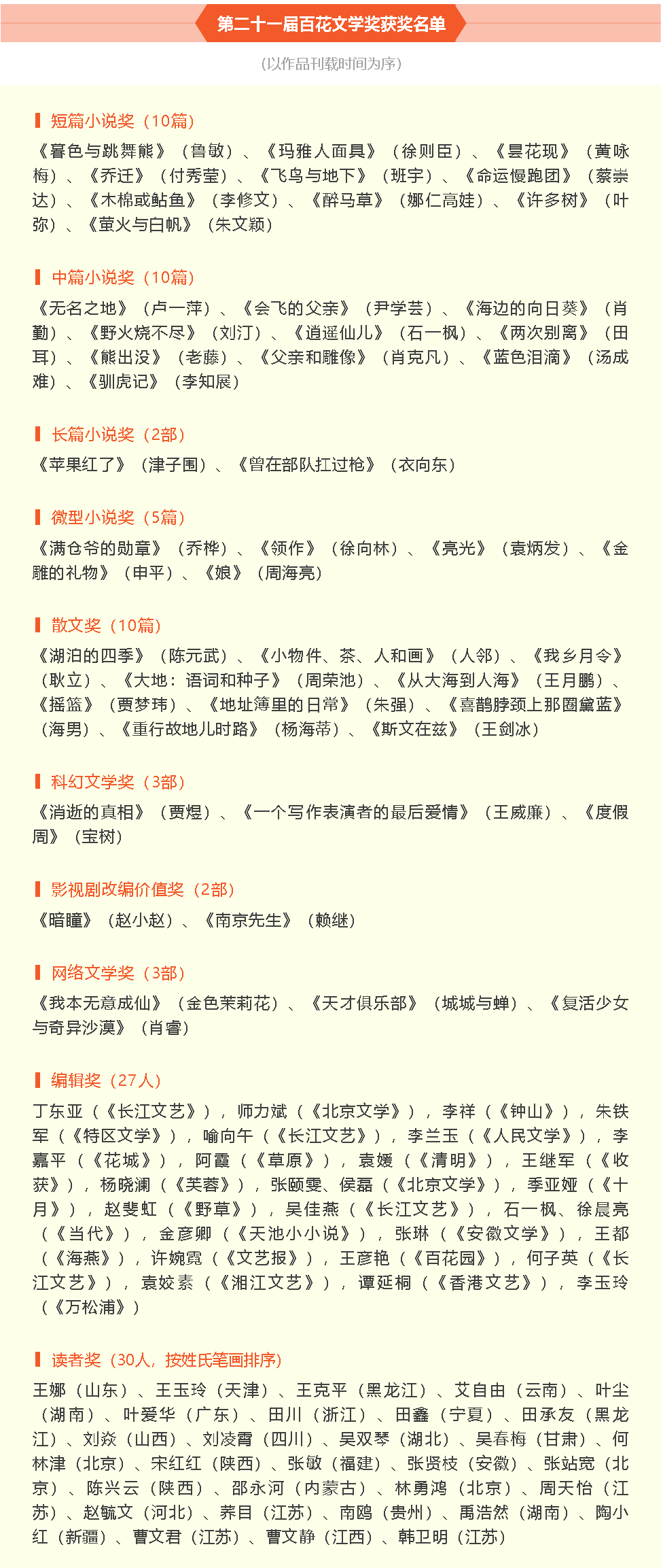 經(jīng)過讀者線上線下投票和專家評審,共評選出短篇小說獎10篇,中篇小說獎10篇,長篇小說獎2篇,微型小說獎5篇,影視劇改編價值獎2篇,散文獎10篇,科幻文學獎3篇,網(wǎng)絡(luò)文學獎3篇。
