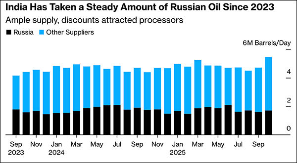 根據(jù)能源分析公司Kpler的估算,10月流向印度的俄羅斯原油日均約為170萬桶,比9月高出約6%,但略低于去年同期水平。