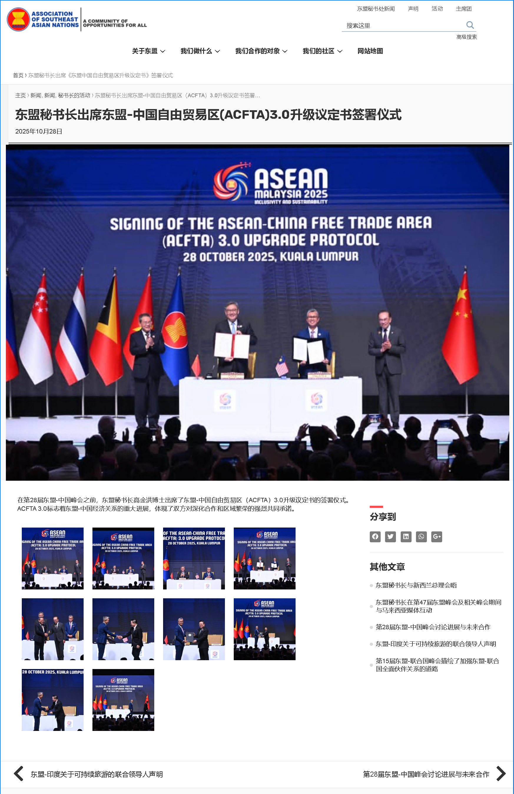 此后,雙方按照領(lǐng)導(dǎo)人指示,加緊開展個(gè)別剩余條款技術(shù)磋商及議定書文本法律審核等后續(xù)工作。經(jīng)過4次特別聯(lián)委會及多輪工作組磋商,雙方于2025年5月全面完成3.0版談判。2025年10月28日,雙方在馬來西亞吉隆坡召開的第28次中國—東盟領(lǐng)導(dǎo)人會議期間,正式簽署3.0版升級議定書。