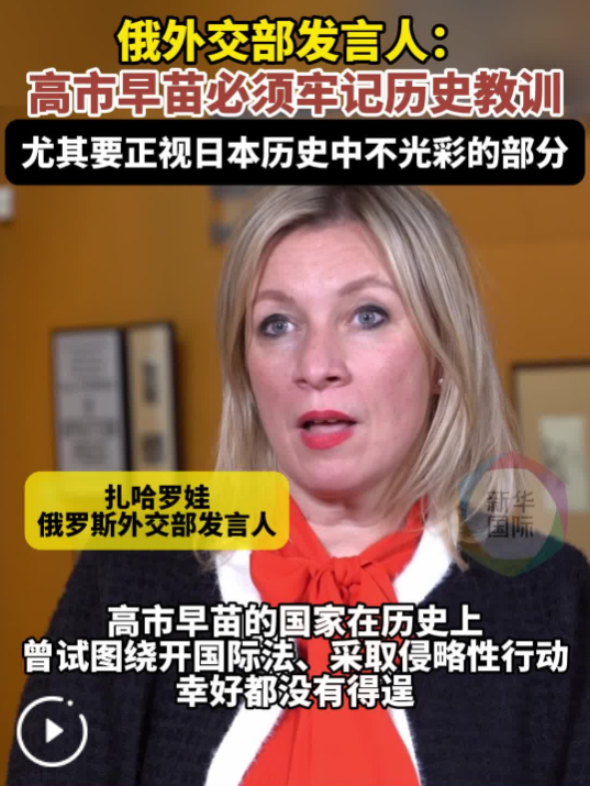 俄羅斯外交部發(fā)言人扎哈羅娃18日在莫斯科接受新華社記者專訪時(shí)表示,日本首相高市早苗日前的涉臺言論非常危險(xiǎn),日本應(yīng)深刻反省歷史、汲取二戰(zhàn)教訓(xùn)。