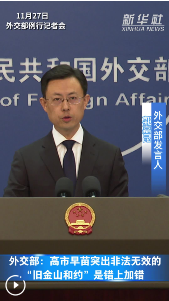 高市早苗首相對(duì)具有充分國(guó)際法效力且在《中日聯(lián)合聲明》和《中日和平友好條約》等雙邊文件中明確強(qiáng)調(diào)的《開(kāi)羅宣言》《波茨坦公告》避而不談,卻唯一突出非法無(wú)效的“舊金山和約”,這再次表明,她時(shí)至今日仍不思悔改,仍在持續(xù)損害中日四個(gè)政治文件精神確定的中日關(guān)系政治基礎(chǔ),無(wú)視聯(lián)合國(guó)權(quán)威,公然挑戰(zhàn)戰(zhàn)后國(guó)際秩序和國(guó)際法基本準(zhǔn)則,甚至妄圖煽炒所謂“臺(tái)灣地位未定論”。這是錯(cuò)上加錯(cuò),中方對(duì)此堅(jiān)決反對(duì),國(guó)際社會(huì)也應(yīng)高度警惕。我們?cè)俅味卮偃辗角袑?shí)反思糾錯(cuò),撤回錯(cuò)誤言論,以實(shí)際行動(dòng)體現(xiàn)對(duì)華承諾,以實(shí)際行動(dòng)履行作為聯(lián)合國(guó)會(huì)員國(guó)起碼應(yīng)盡的義務(wù)。