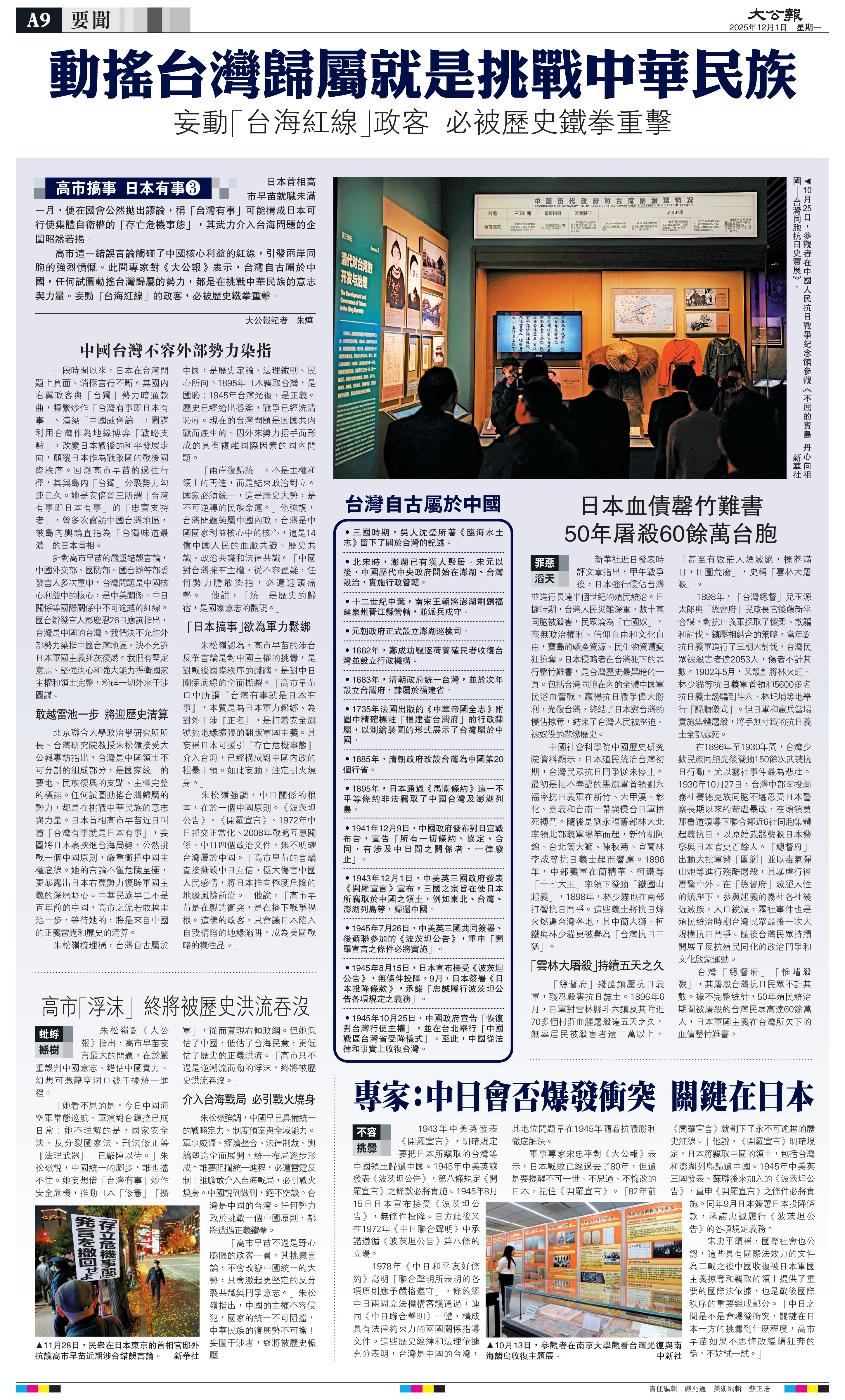 日方避而不談的,恐怕不僅僅是在臺(tái)灣問題上的立場(chǎng)。今天是《開羅宣言》發(fā)表82周年?!堕_羅宣言》等一系列國(guó)際法律文件不僅明確了中國(guó)對(duì)臺(tái)灣的主權(quán),更是世界反法西斯戰(zhàn)爭(zhēng)的重大成果,構(gòu)成戰(zhàn)后國(guó)際秩序的重要組成部分。遵守其有關(guān)規(guī)定是日方必須承擔(dān)的國(guó)際法義務(wù),也是戰(zhàn)后日本重獲國(guó)際社會(huì)接納的前提?,F(xiàn)在日方只字不提具有充分國(guó)際法效力的上述文件,卻一味引用一個(gè)把受日本殖民侵略最嚴(yán)重的亞洲鄰國(guó)特別是中國(guó)排斥在外的文件,這是對(duì)日本軍國(guó)主義侵略慘痛記憶的漠視,對(duì)世界反法西斯戰(zhàn)爭(zhēng)歷史真相的褻瀆,對(duì)聯(lián)合國(guó)權(quán)威和戰(zhàn)后國(guó)際秩序的公然挑戰(zhàn)。日方近年來大幅調(diào)整安保政策,逐年增加防衛(wèi)預(yù)算,圖謀修改“無核三原則”。日本某些勢(shì)力正極力突破“和平憲法”束縛,企圖違背國(guó)際法規(guī)定的戰(zhàn)敗國(guó)義務(wù)。這些人從未真正汲取歷史教訓(xùn),從未真正直面和反思日本在戰(zhàn)爭(zhēng)中犯下的滔天罪責(zé),從未真正遏止軍國(guó)主義在日本死灰復(fù)燃,反而企圖用美化侵略的敘事和“避而不談”的手法,讓世人遺忘,為自己“松綁”。這種伎倆欺騙不了世人。