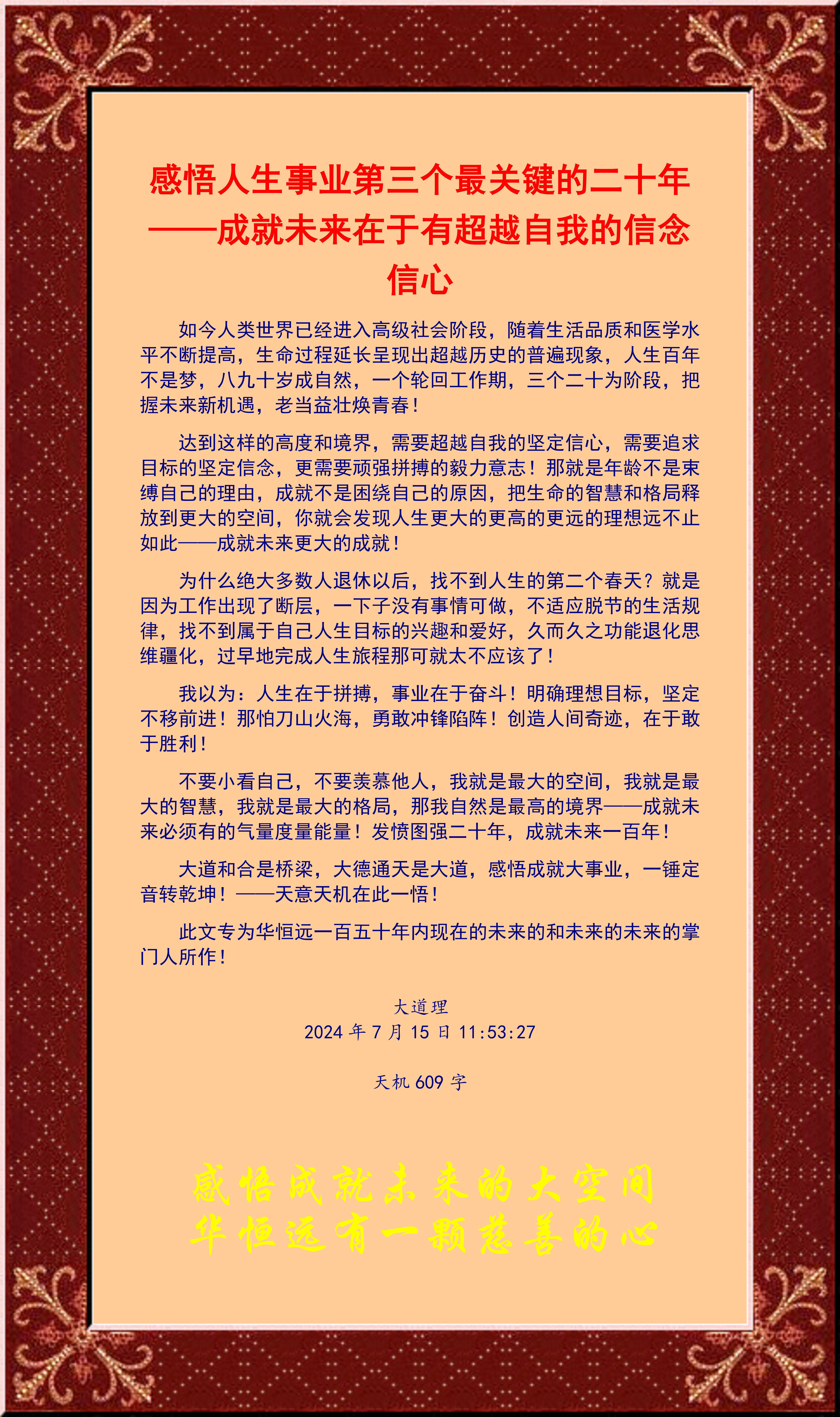 不要小看自己,不要羨慕他人,我就是最大的空間,我就是最大的智慧,我就是最大的格局,那我自然是最高的境界——成就未來必須有的氣量度量能量!發(fā)憤圖強(qiáng)二十年,成就未來一百年!