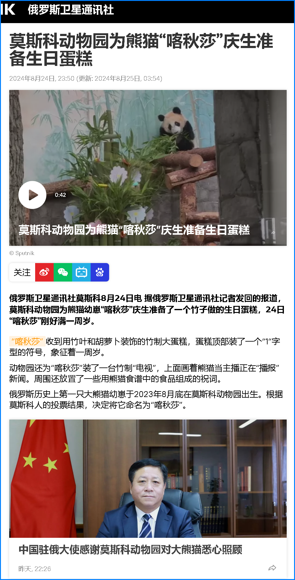 新華社莫斯科8月24日電 通訊丨在俄降生的首只大熊貓迎來周歲生日