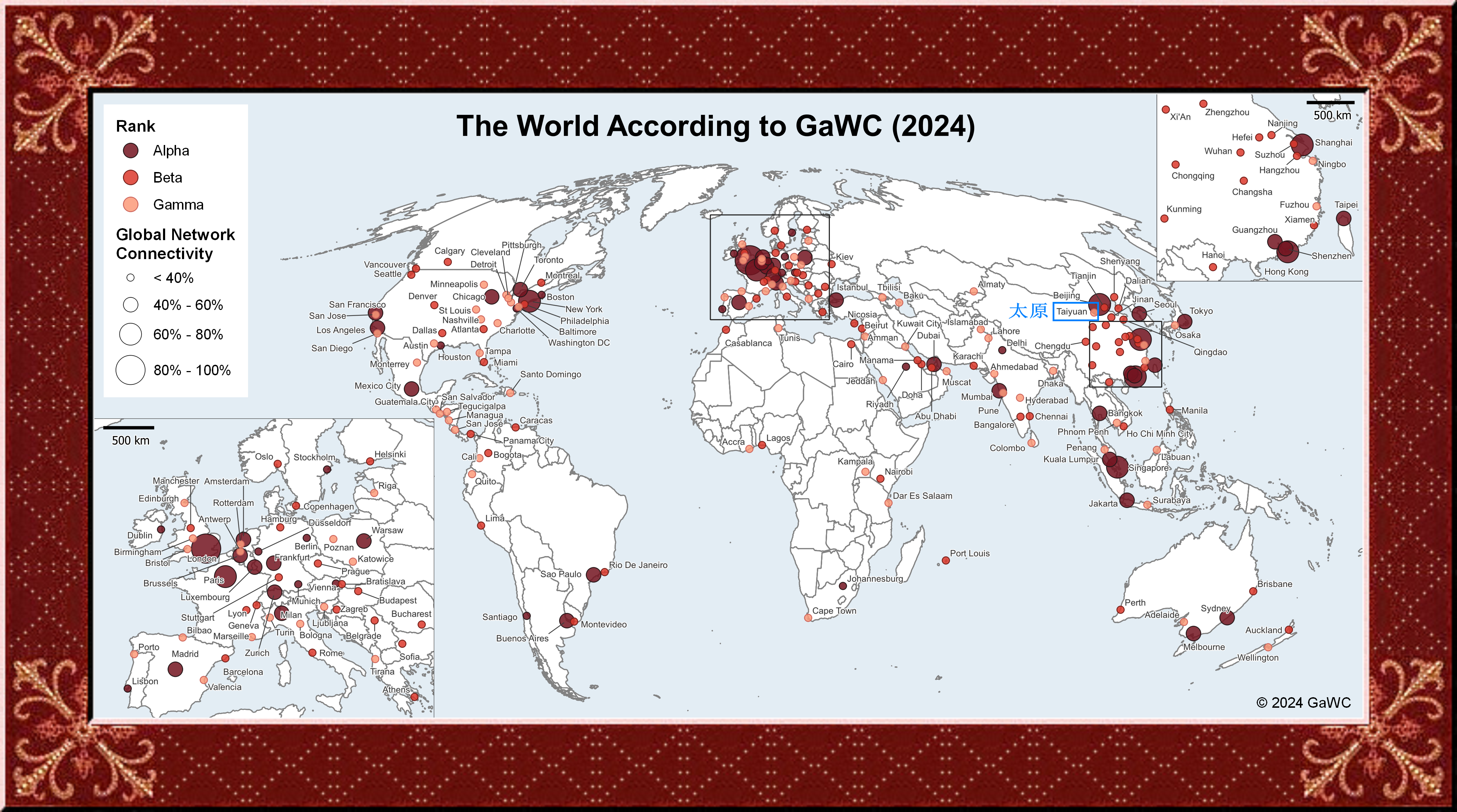 使用 GaWC 的聯(lián)鎖網(wǎng)絡(luò)模型對城市的先進(jìn)生產(chǎn)性服務(wù)業(yè)進(jìn)行評估。流量的間接測量用于計(jì)算城市的網(wǎng)絡(luò)連通性,從而衡量城市融入世界城市網(wǎng)絡(luò)的程度。