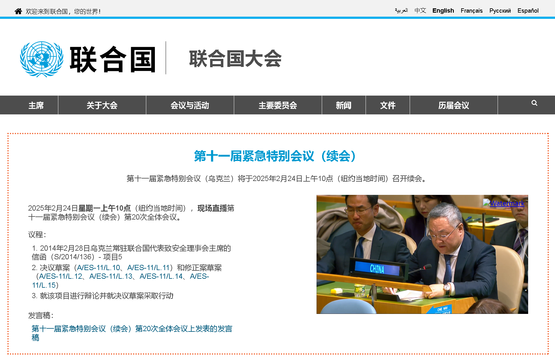 2025年2月24日星期一上午10點(diǎn)(紐約當(dāng)?shù)貢r(shí)間),現(xiàn)場(chǎng)直播第十一屆緊急特別會(huì)議(續(xù)會(huì))第20次全體會(huì)議。