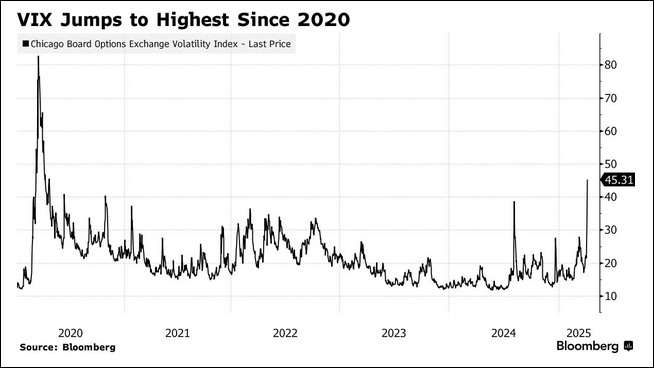 “關(guān)稅焦慮席卷華爾街”,CNN稱,雖然美國當天(4日)發(fā)布的就業(yè)增長數(shù)據(jù)超出預(yù)期,但關(guān)稅焦慮依然主導市場情緒。芝加哥期權(quán)交易所(Cboe)波動率指數(shù)(即VIX“恐慌指數(shù)”)暴漲50%,飆升至45以上,達2020年以來最高點。