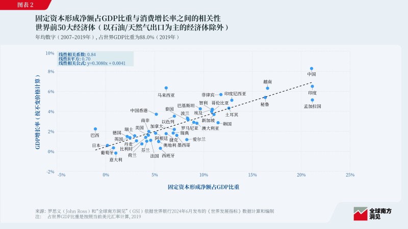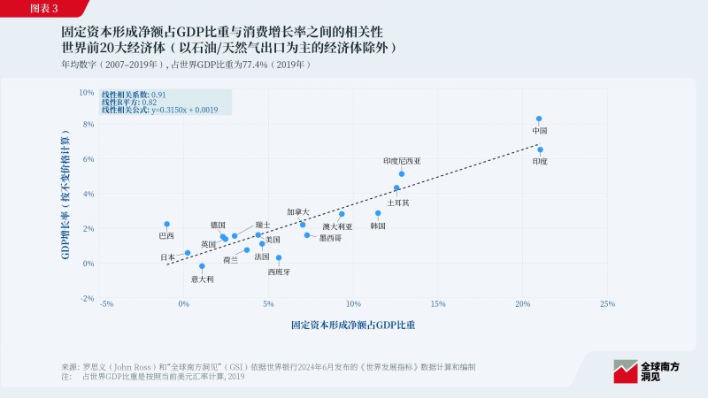 固定資本形成凈額占GDP比重與消費增長高度相關(guān),且經(jīng)濟(jì)規(guī)模越大相關(guān)性越強(qiáng)