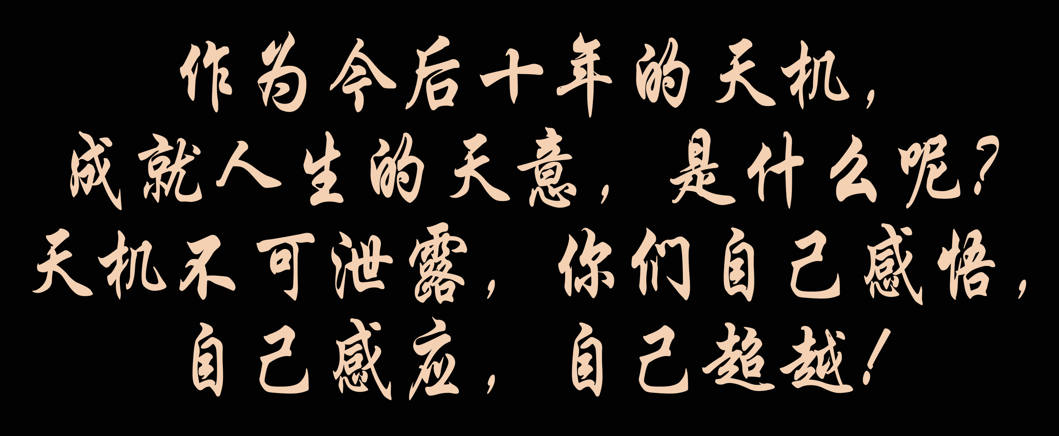 作為今后十年的天機,成就人生的天意,是什么呢?天機不可泄露,你們自己感悟,自己感應,自己超越!