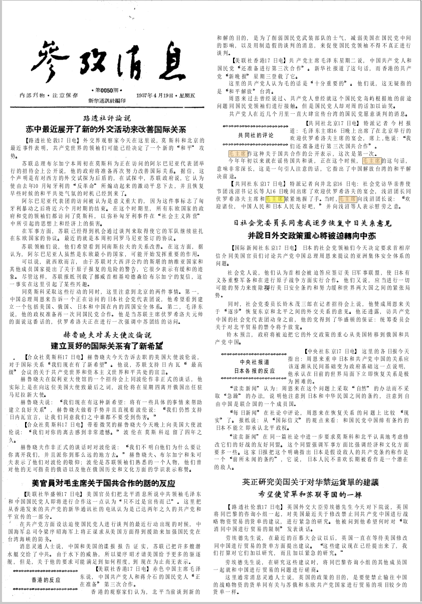 對于即將舉行包括共產(chǎn)黨中國問題的討論在內(nèi)的日美會談的岸信介內(nèi)閣說來,它對社會黨使節(jié)團(tuán)同毛主席的會見,表示相當(dāng)關(guān)心,這是不言而喻的。岸信介內(nèi)閣和自由民主黨的對共產(chǎn)黨中國方針是把接觸盡可能限制在經(jīng)濟(jì)和文化范圍內(nèi),而不走進(jìn)政治領(lǐng)域。但是根據(jù)過去政府的態(tài)度來看,要說政府對經(jīng)濟(jì)和文化接觸抱過熱情,就是在情義上也說不出口來。的確,在政治上是有多方面的困難的,但是在正視國際形勢的時候,如果始終采取目前這樣的消極態(tài)度,只會使國民的希望落空。至少在文化、經(jīng)濟(jì)交流等方面,即使更進(jìn)一步拿出熱情來,照理美國也不會在表面上露出不滿。不可否認(rèn),日中關(guān)系為日美關(guān)系所左右,是個事實,不過政府有無積極的熱情,在相當(dāng)程度上是能夠使這個關(guān)系更富于靈活性的。
